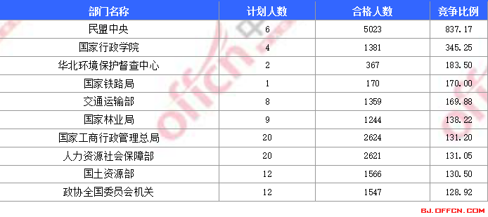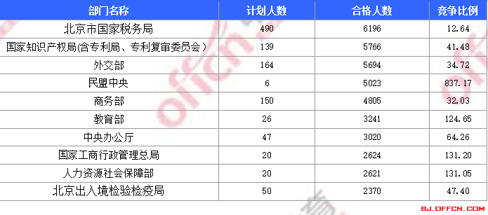 為幫助廣大考生更清晰的了解今日?qǐng)?bào)名情況,北京中公網(wǎng)校整理了合格人數(shù)前十位的部門以及競(jìng)爭(zhēng)比例最激烈的十大部門,供廣大考生參考: