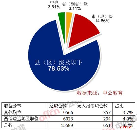 國(guó)考那邊熱鬧,這邊卻冷清。與熱門職位形成強(qiáng)烈對(duì)比的是,目前仍有2510個(gè)職位尚未達(dá)到面試比例,其中包含651個(gè)無人問津的職位。據(jù)中公網(wǎng)校分析,在這2510個(gè)職位中,78%的職位來自縣(區(qū))級(jí)及以下,僅有不到7%的職位來自中央和省級(jí),可見考生還是比較偏愛中央和省級(jí)職位的。另外,在651個(gè)無人報(bào)考的職位中,有294個(gè)屬于西部邊遠(yuǎn)地區(qū)職位,占西部邊遠(yuǎn)地區(qū)總招錄職位數(shù)的4.9%,超出其他普通職位的1.2%。