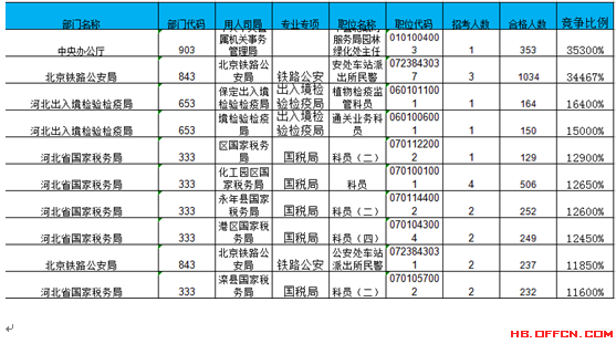報(bào)名通過審核人數(shù)前十的職位主要集中在北京鐵路公安局、河北省國家稅務(wù)局、中央辦公廳等部門,具體信息如下: