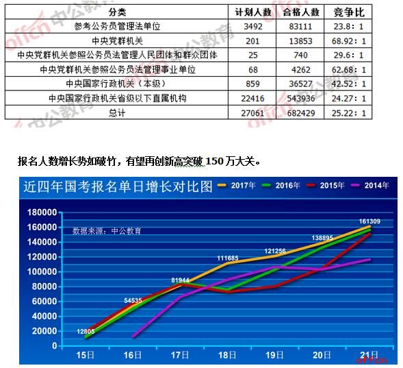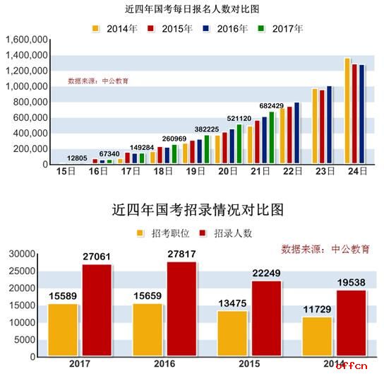 2014國考報(bào)名數(shù)據(jù)是史上最“輝煌”的一年,報(bào)名總?cè)藬?shù)達(dá)到152萬,當(dāng)年此時(shí)報(bào)名人數(shù)僅為495329人,22日增加229546人,23日增加251834人,報(bào)名截止日當(dāng)天增加390424人,最終達(dá)到152萬的高峰值,而今年此時(shí)報(bào)名人數(shù)為682429人,高出當(dāng)年同期18萬余人,如果在未來三天報(bào)名中能保持2014國考報(bào)名最后三天的單日增長量,明日報(bào)名人數(shù)將有可能接近90萬,23日此時(shí)能115萬,24日報(bào)名截止日當(dāng)天預(yù)計(jì)將達(dá)到155萬!另外,今年國考的招錄人數(shù)也是近年來排名第二的,招錄基數(shù)大,必然也會(huì)吸引更多的考生報(bào)考。