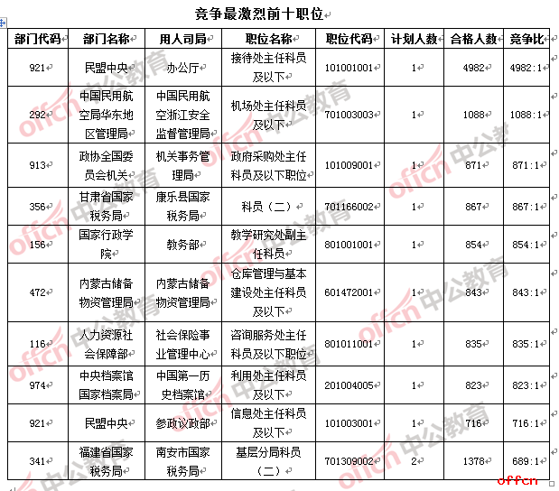 從競爭比上來看,與去年同期只有7個部門超過800:1相比,今年有8個職位“順利過關(guān)”。但從整體上來看,今年報考職位的“熱冷兩重天”的特點突顯,最熱職位或可超5000大關(guān),而在競爭比排行榜中排名第二的職位僅1088:1,兩者可謂“天淵之別”。