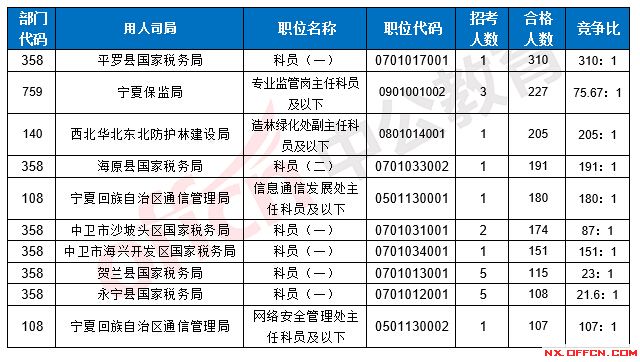 截止到22日16時(shí),競爭比例的職位為平羅縣國家稅務(wù)局科員(一)一職,招錄1人,截止到22日16時(shí)合格人數(shù)為310人,具體信息如下: