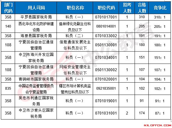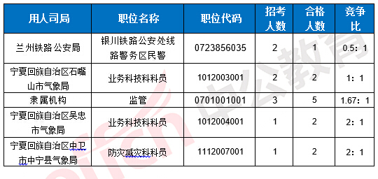 截止到22日16時(shí),工作地點(diǎn)在寧夏的職位均有人報(bào)考,其中5職位競爭比低于面試比例。下面是爭比例低于面試比例職位一覽表,中公教育專家建議廣大考生多關(guān)注一些較冷職位,避免激烈競爭,結(jié)合自身?xiàng)l件,找到屬于自己的職位。