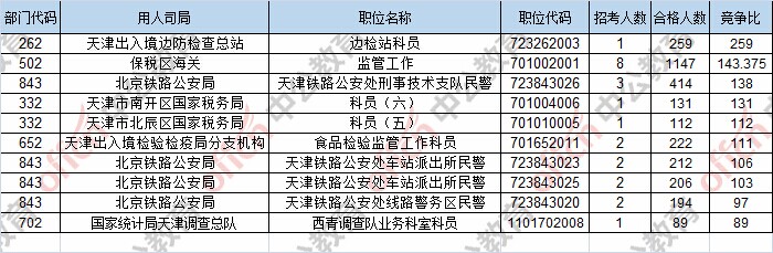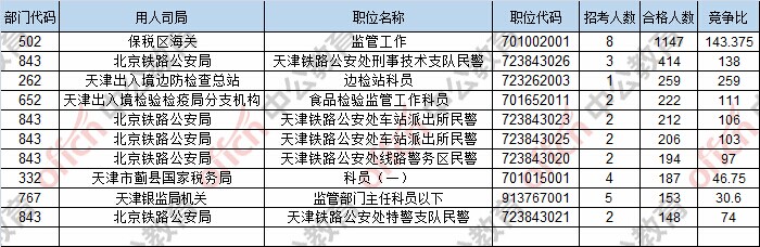 報(bào)名通過審核人數(shù)前十的職位主要集中在保稅區(qū)海關(guān)、北京鐵路公安局、天津出入境邊防檢查總站,具體信息如下: