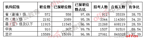 中央層級職位競爭比遠遠高于縣級以下職位,競爭比近60:1。