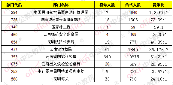 報名通過審核人數(shù)前十的職位主要集中在中國民用航空局西南地區(qū)管理局、云南省國家稅務局、云南省氣象局等,具體信息如下: