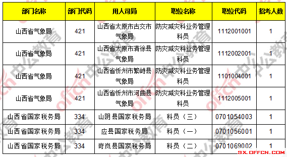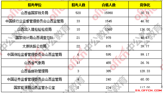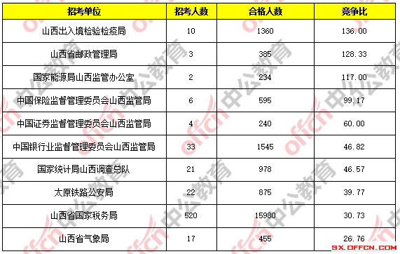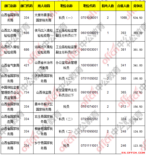 報考人數(shù)前十的職位主要集中在山西省國家稅務局、山西出入境檢驗檢疫局這兩個部門,具體信息如下: