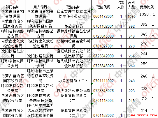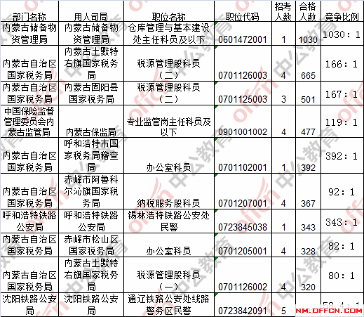 報(bào)名通過(guò)審核人數(shù)前十的職位主要集中在內(nèi)蒙古儲(chǔ)備物資管理局、內(nèi)蒙古土默特右旗國(guó)家稅務(wù)局、內(nèi)蒙古固陽(yáng)縣國(guó)家稅務(wù)局等部門(mén),具體信息如下: