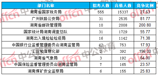 通過審核人數(shù)前三位的部門依次是:湖南省國家稅務(wù)局、廣州鐵路公安局、湖南省郵政管理局,三部門通過審核總?cè)藬?shù)為19880人,占通過審核總?cè)藬?shù)的80.74%。