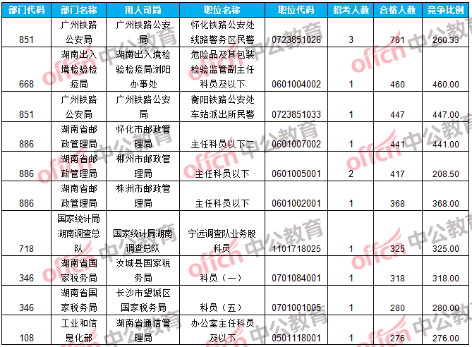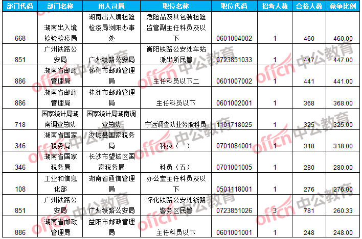 報名通過審核人數(shù)前十的職位主要集中在廣州鐵路公安局、湖南省郵政管理局等部門,具體信息如下: