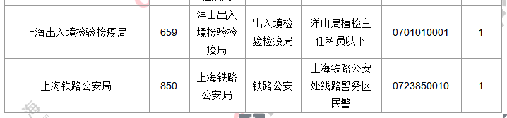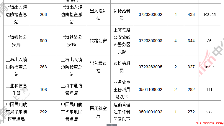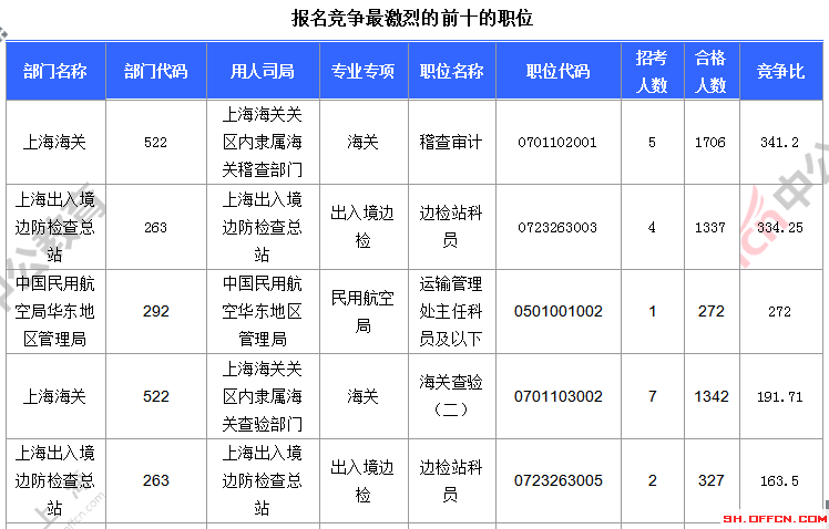 截止到23日16時(shí),上海海關(guān)稽查審計(jì)一職擊敗上海出入境邊防檢查總站邊檢站科員成為競(jìng)爭(zhēng)比例的職位,招錄5人,截止到23日16時(shí)通過人數(shù)為1706人。報(bào)名通過審核人數(shù)前十的職位主要集中在上海海關(guān)、上海出入境邊防檢查總站、上海鐵路公安局等部門,具體信息如下: