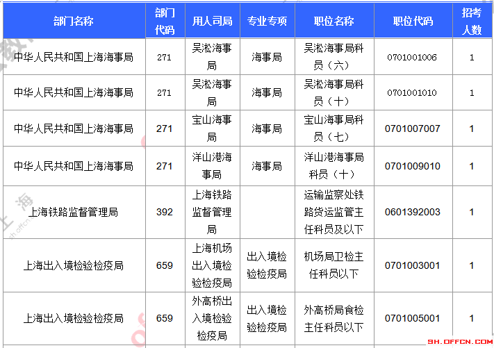 截止到23日16時(shí),工作地點(diǎn)在上海的職位共有9個(gè)無人報(bào)考,占全部職位的2.6%。下面是無人報(bào)考職位一覽表,上海中公網(wǎng)校專家建議廣大考生多關(guān)注一些較冷職位,避免激烈競(jìng)爭(zhēng),結(jié)合自身?xiàng)l件,找到屬于自己的職位。