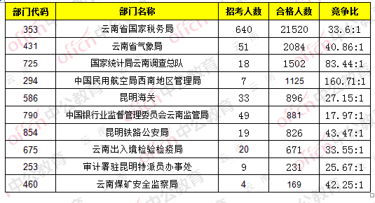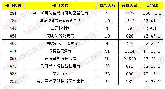 報名通過審核人數(shù)前十的職位主要集中在中國民用航空局西南地區(qū)管理局、云南省國家稅務(wù)局、國家統(tǒng)計局云南調(diào)查總隊等部門,具體信息如下: