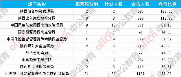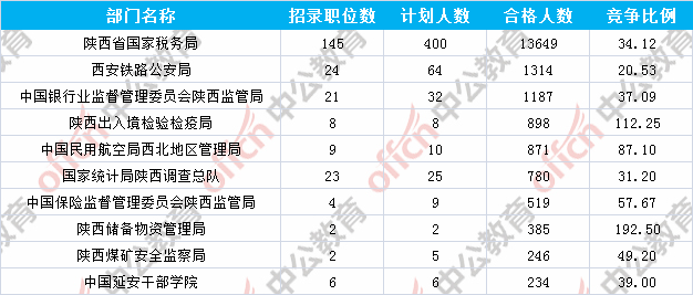 為幫助廣大考生更清晰的了解今日報名情況,陜西中公網校整理了審核通過人數(shù)前十位的部門以及競爭比例最激烈的十大部門,供廣大考生參考: