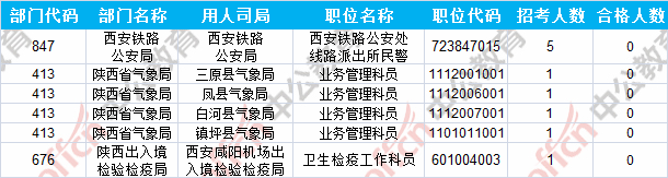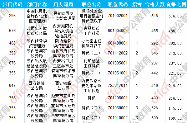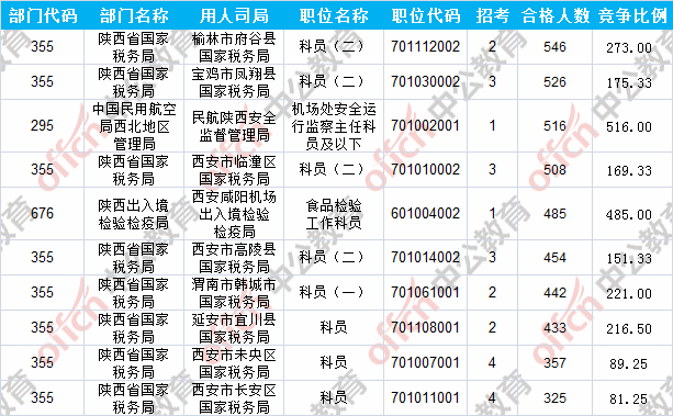 報名通過審核人數(shù)前十的職位主要集中在陜西省國家稅務局、中國民用航空局西北地區(qū)管理局、陜西出入境檢驗檢疫局等部門,具體信息如下: