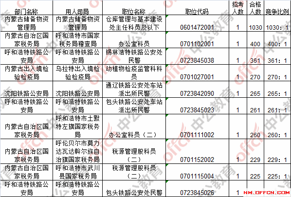 截止到24日8時,競爭比例的職位為內(nèi)蒙古儲備物資管理局倉庫管理與基本建設(shè)處主任科員及以下一職,招錄1人,截止到24日8時通過人數(shù)為1030人!