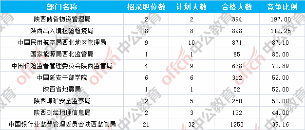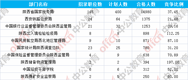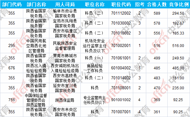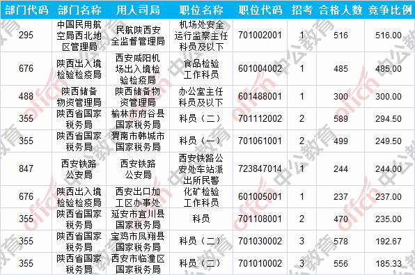 報(bào)名通過審核人數(shù)前十的職位主要集中在陜西出入境檢驗(yàn)檢疫局、陜西省國家稅務(wù)局、中國民用航空局西北地區(qū)管理局等部門,具體信息如下: