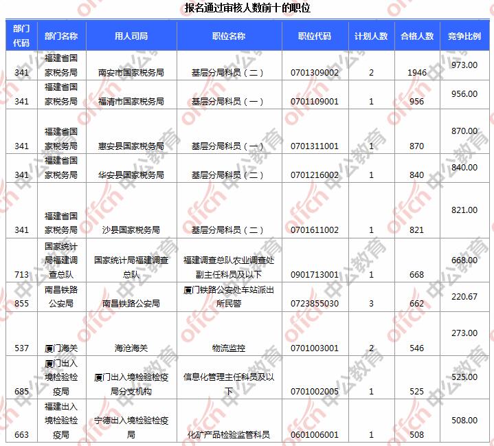 報名通過審核人數(shù)前十的職位主要集中在南安市國家稅務局、福清市國家稅務局、惠安縣國家稅務局等部門,具體信息如下: