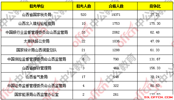 截止到24日18時(shí),合格人數(shù)前三位的部門依次是:山西省國(guó)家稅務(wù)局、山西出入境檢驗(yàn)檢疫局、中國(guó)銀行業(yè)監(jiān)督管理委員會(huì)山西監(jiān)管局,其中山西省國(guó)家稅務(wù)局的合格人數(shù)達(dá)19371人,占審核合格總?cè)藬?shù)的68.49%。