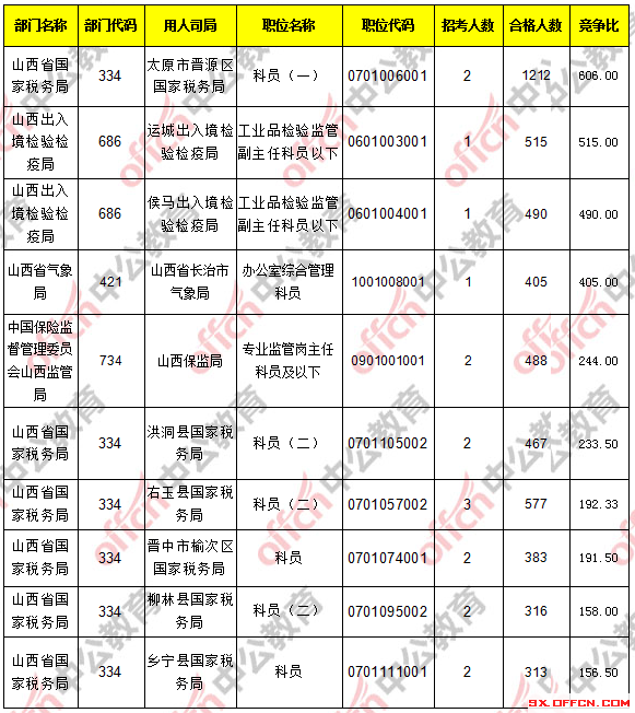 報(bào)考人數(shù)前十的職位主要集中在山西省國(guó)家稅務(wù)局、山西出入境檢驗(yàn)檢疫局這兩個(gè)部門,具體信息如下: