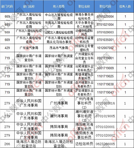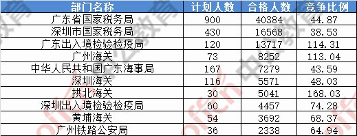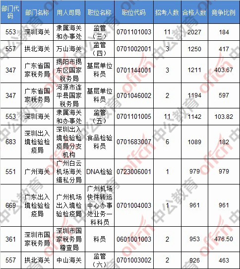 報名通過審核人數(shù)前十的職位主要集中在深圳海關(guān)、拱北海關(guān)、廣東省國家稅務(wù)局,具體信息如下: