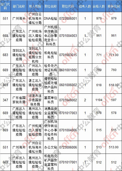 截止到24日17點(diǎn)30分,競爭比例的職位為廣州海關(guān)廣州白云機(jī)場海關(guān)緝私分局DNA檢驗(yàn)一職,招錄1人,截止到24日17點(diǎn)30分通過人數(shù)為979人。