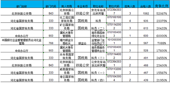 報(bào)名通過(guò)審核人數(shù)前十的職位主要集中在北京鐵路公安局、河北省國(guó)家稅務(wù)局、中央辦公廳等部門(mén),具體信息如下: