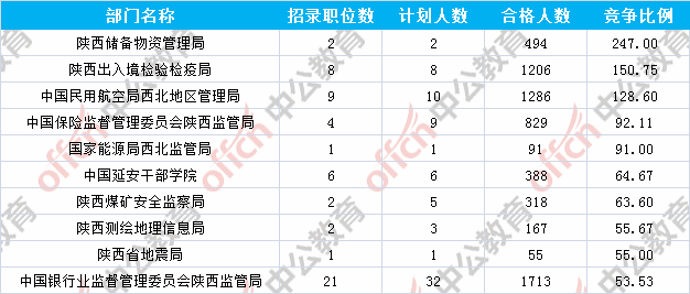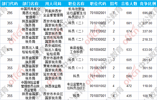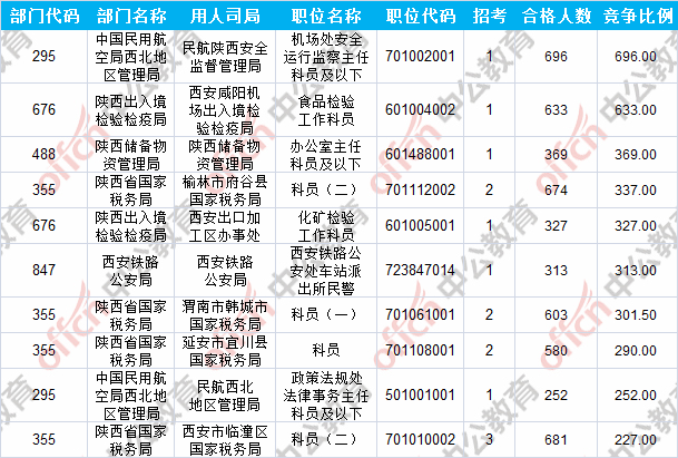 報(bào)名通過(guò)審核人數(shù)前十的職位主要集中在中國(guó)民用航空局西北地區(qū)管理局、陜西省國(guó)家稅務(wù)局、陜西出入境檢驗(yàn)檢疫局等部門,具體信息如下: