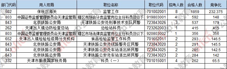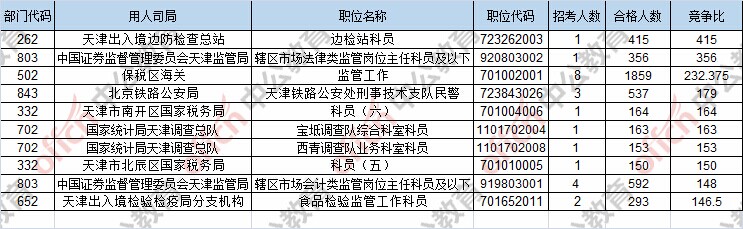 報(bào)名通過審核人數(shù)前十的職位主要集中在保稅區(qū)海關(guān)、中國證券監(jiān)督管理委員會(huì)天津監(jiān)管局、北京鐵路公安局,具體信息如下: