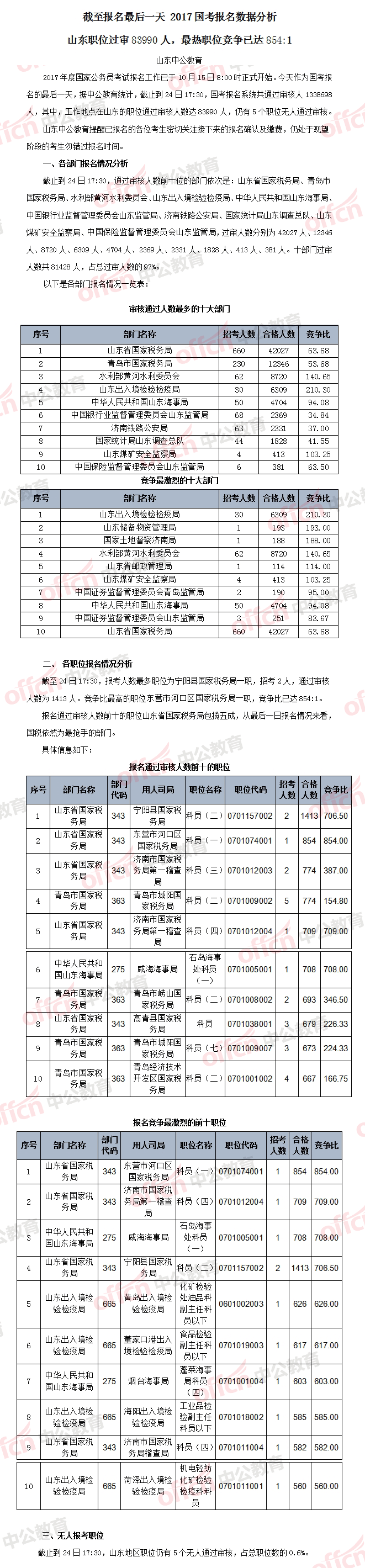 【截至24日17:30】2017國考報名山東職位過審83990人,最熱職位競爭已達854:1