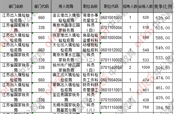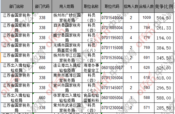 報名通過審核人數(shù)前十的職位主要集中在江蘇省國家稅務(wù)局、江蘇出入境檢驗(yàn)檢疫局,具體信息如下: