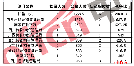 2017國(guó)考競(jìng)爭(zhēng)最激烈部門毫無懸念由民盟中央獲得,該部門僅招錄6人,合格人數(shù)已經(jīng)12245:1,競(jìng)爭(zhēng)比達(dá)2040:1,這也是因?yàn)閳?bào)考職位出自民盟中央,以此拉高了整體競(jìng)爭(zhēng)比例,除此以外,儲(chǔ)備物資管理局也是考生競(jìng)爭(zhēng)的部門,競(jìng)爭(zhēng)最激烈的十大部門中,就有六個(gè)來自此系統(tǒng),競(jìng)爭(zhēng)比達(dá)687.5:1。