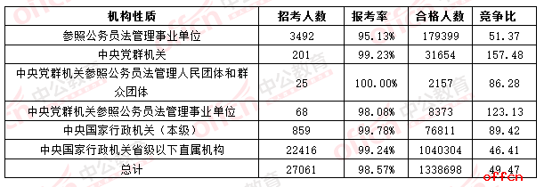 從五大系統(tǒng)分析,僅有中央黨群機關(guān)參照公務(wù)員法管理人民團體和群眾團體博考慮達(dá)到百分之百,中央黨群機關(guān)、中央黨群機關(guān)參照公務(wù)員法管理事業(yè)單位和中央國家行政機關(guān)(本級)這三個系統(tǒng)均留下一個“老大難”職位,其中,中央黨群機關(guān)參照公務(wù)員法管理事業(yè)單位和中央黨群機關(guān)兩個系統(tǒng)的競爭比例超過了100:1,分別為123.13、157.48,可見中央黨群是考生偏愛的對象。