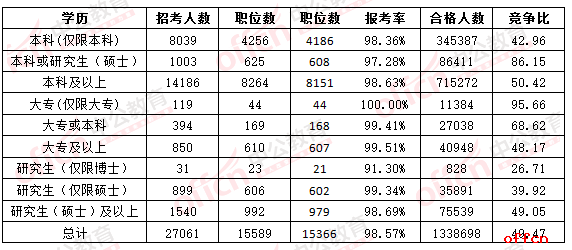 從各學(xué)歷報考情況來看,要求大專(僅限大專)學(xué)歷的職位的報考率達(dá)到了100%,要求為大?;虮究茖W(xué)歷的共計169個職位,僅剩1個職位無人報考。競爭比的是要求大專(僅限大專)的職位,競爭比高達(dá)95.66:1,基本上接近百里挑一。學(xué)歷要求越高競爭比越低,要求博士研究生學(xué)歷的職位競爭比最低,僅為26.7:1。