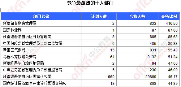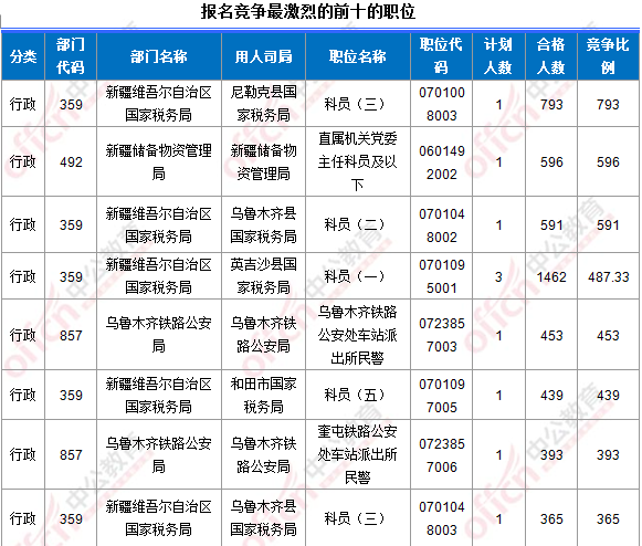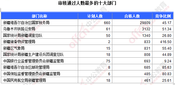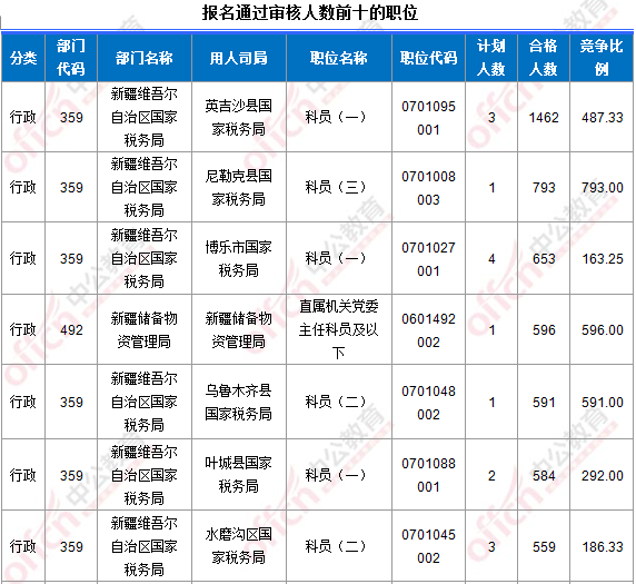 為幫助廣大考生更清晰的了解今日?qǐng)?bào)名情況,新疆中公網(wǎng)校整理了審核通過(guò)人數(shù)前十位的部門以及競(jìng)爭(zhēng)比例最激烈的十大部門,供廣大考生參考:
