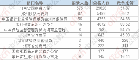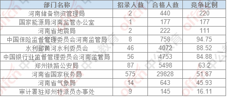 截止24日17:30,通過(guò)審核人數(shù)前三位的部門依次是:河南省國(guó)家稅務(wù)局、鄭州鐵路公安局,中國(guó)銀行業(yè)監(jiān)督管理委員會(huì)河南監(jiān)管局,三部門通過(guò)審核總?cè)藬?shù)40079人,占通過(guò)審核總?cè)藬?shù)的86.08%。
