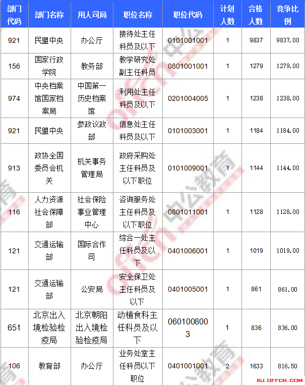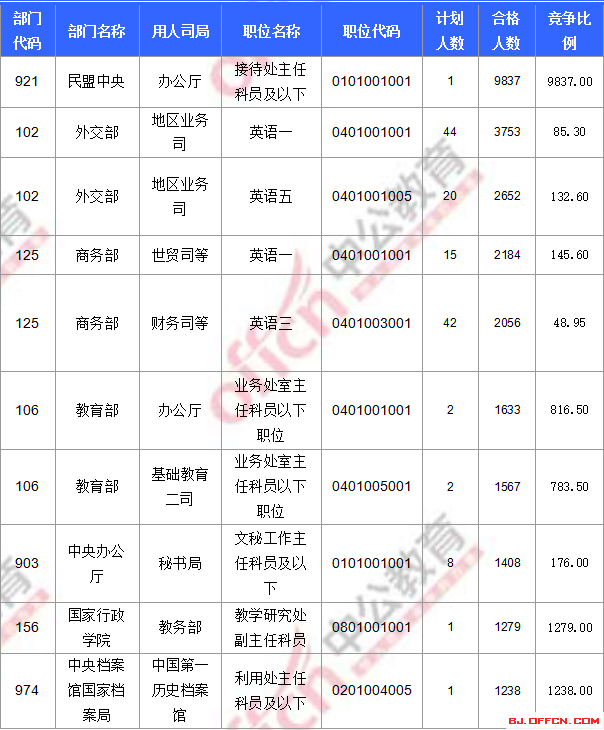 合格人數(shù)前十的職位主要集中在外交部、民盟中央、商務(wù)部等部門,具體信息如下: