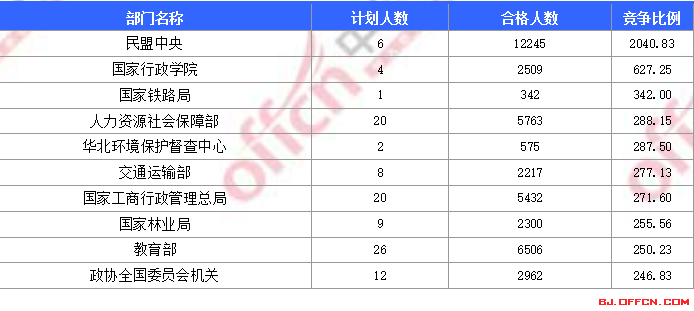 為幫助廣大考生更清晰的了解今日報名情況,中公網(wǎng)校中公教育整理了合格人數(shù)前十位的部門以及競爭比例最激烈的十大部門,供廣大考生參考: