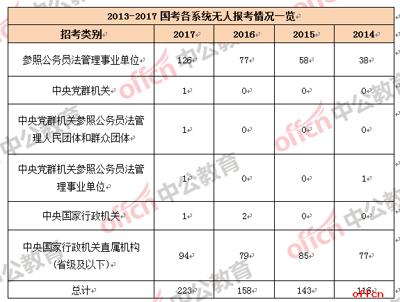 本次國(guó)考共223個(gè)職位無(wú)人通過(guò)審核,其中,數(shù)量較多的系統(tǒng)為中央國(guó)家行政機(jī)關(guān)直屬機(jī)構(gòu)(省級(jí)及以下)和參照公務(wù)員法管理事業(yè)單位,分別有94、126個(gè)職位暫無(wú)審核通過(guò)人數(shù),其余系統(tǒng)均僅有1職位未破零。從近四年的無(wú)人報(bào)考數(shù)據(jù)來(lái)看,2017年無(wú)人報(bào)考的職位大大遠(yuǎn)超往年,這也可以看出,今年報(bào)考的“熱冷兩重天”趨勢(shì)非常嚴(yán)峻。