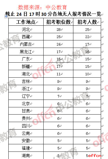 通過(guò)中公網(wǎng)校統(tǒng)計(jì)數(shù)據(jù)可以看到,工作地點(diǎn)在河北省的職位無(wú)人通過(guò)審核數(shù)量最多,為28個(gè)職位,次之是西藏和內(nèi)蒙古,而考生報(bào)考江蘇和重慶兩地的“熱情”相對(duì)“高漲”,只有1個(gè)職位無(wú)人報(bào)考。