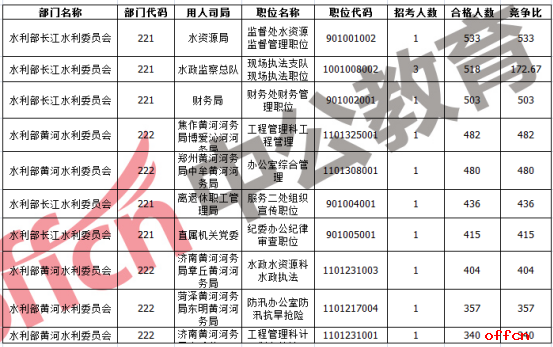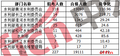 2017國考水利系統(tǒng)32個部門共提供223個職位,招錄227人。截至24日17:30,總報名審核通過人數(shù)為19111人,競爭比例為84:1,仍有3個職位無人報考,其余所有職位均有人通過審核。下面是中公網(wǎng)校統(tǒng)計的水利系統(tǒng)報名情況,供考生參考: