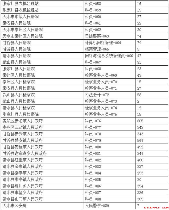 2017年度甘肅省考試錄用機(jī)關(guān)公務(wù)員和參照公務(wù)員法管理單位工作人員,網(wǎng)上報(bào)名已進(jìn)入尾聲,3月20日24時提交報(bào)考申請將結(jié)束。根據(jù)省考錄辦統(tǒng)計(jì),截至3月20日17時,天水市最為激烈的為秦州區(qū)地稅局,已有594人報(bào)名。令人意外的是,天水市財(cái)政局科員-004崗位爆出冷門,只有7人報(bào)考。