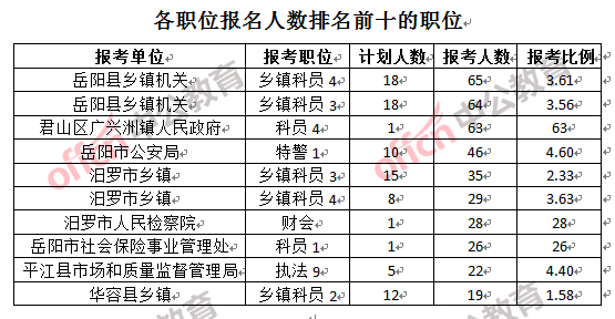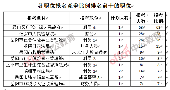 為幫助廣大考生更清晰的了解報名情況,中公教育整理了岳陽市各職位的報名人數(shù)排名以及競爭比例排名,供廣大考生參考: