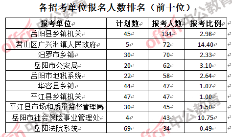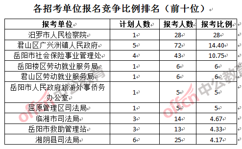 競爭熱門招考單位,前三位依次是:汨羅市人民檢察院(競爭比例28:1)、君山區(qū)廣興洲鎮(zhèn)人民政府(競爭比例14.4:1)和岳陽市社會保險事業(yè)管理處(競爭比例10.75:1)。