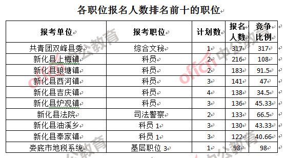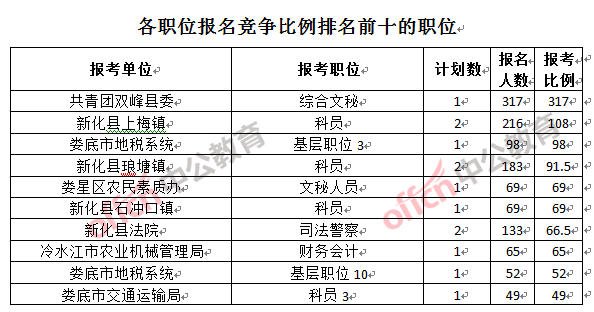 競爭熱門職位,前三位依次是:共青團雙峰縣委綜合文秘(競爭比例317:1)、新化縣上梅鎮(zhèn)科員(競爭比例108:1)和婁底市地稅系統(tǒng)基層職位3(競爭比例98:1)。