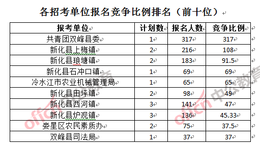 競爭熱門招考單位,前三位依次是:共青團雙峰縣委(競爭比例317:1)、新化縣上梅鎮(zhèn)(競爭比例108:1)和新化縣瑯塘鎮(zhèn)(競爭比例91.5:1)。