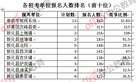 為幫助廣大考生更清晰的了解報名情況,中公教育整理了婁底市各招考單位的報名人數(shù)排名以及競爭比例排名,供廣大考生參考:
