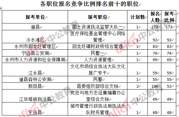 競爭熱門招考單位,前三位依次是:道縣森林公安局(競爭比例55:1)、中國共產(chǎn)主義青年團(tuán)永州市委(競爭比例32:1)和永州市回龍圩管理區(qū)(競爭比例28.83:1)。