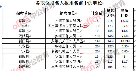為幫助廣大考生更清晰的了解報(bào)名情況,中公教育整理了永州各職位的報(bào)名人數(shù)排名以及競爭比例排名,供廣大考生參考: