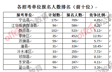 為幫助廣大考生更清晰的了解報(bào)名情況,中公教育整理了永州各招考單位的報(bào)名人數(shù)排名以及競爭比例排名,供廣大考生參考: